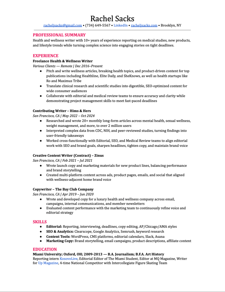 Whether you need someone to craft compelling health and wellness articles, create SEO-friendly content, or write marketing copy that converts, I’d love to help! Don’t hesitate to contact me here or at racheljsacks@gmail.com.